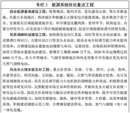加強電力系統調峰能力建設。 加快大型抽水蓄能電站、龍頭水電站、 天然氣調峰電站等優質調峰電源建設, 加大既有熱電聯產機組、 燃煤發電機組調峰靈活性改造力度, 改善電力系統調峰性能, 減少冗余裝機和運行成本, 提高可再生能源消納能力。 積極開展儲能示范工程建設, 推動儲能系統與新能源、 電力系統協調優化運行。 推進電力系統運行模式變革, 實施節能低碳調度機制, 加快電力現貨市場及電力輔助服務市場建設, 合理補償電力調峰成本。