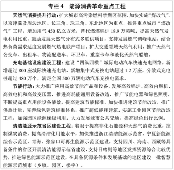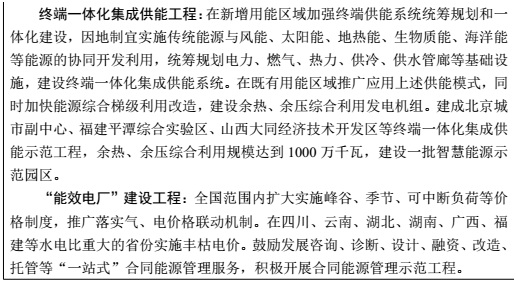 工程, 實施城市配電網建設改造行動, 強化統一規劃, 健全技術標準, 適度超前建設, 促進城鄉網源協調發展。 統籌電網升級改造與電能替代, 滿足居民采暖領域電能替代。 積極推進棚戶區改造配套熱電聯產機組建設。 加快天然氣支線管網建設, 擴大管網覆蓋范圍。 在天然氣管網未覆蓋地區推進液化天然氣、 壓縮天然氣、 液化石油氣直供, 保障民生用氣。推動水電氣熱計量器具智能化升級改造, 加強能源資源精細化管理。 積極推進城市地下綜合管廊建設, 鼓勵能源管網與通信、 供水等管線統一規劃、 設計和施工, 促進城市空間集約化利用。