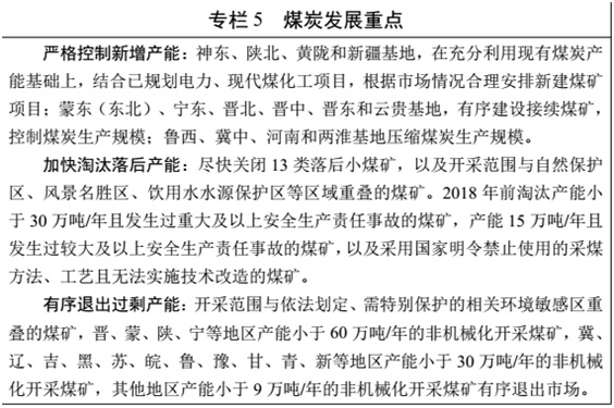 ——煤炭。 嚴格控制審批新建煤礦項目、 新增產能技術改造項目和生產能力核增項目, 確需新建煤礦的, 實行減量置換。 運用市場化手段以及安全、 環保、 技術、 質量等標準,加快淘汰落后產能和不符合產業政策的產能, 積極引導安全無保障、 資源枯竭、 賦存條件差、 環境污染重、 長期虧損的煤礦產能有序退出, 推進企業兼并重組, 鼓勵煤、 電、 化等上下游產業一體化經營。 實行煤炭產能登記公告制度, 嚴格治理違法違規煤礦項目建設, 控制超能力生產。 “ 十三五”期間, 停緩建一批在建煤礦項目, 14 個大型煤炭基地生產能力達到全國的 95%以上。