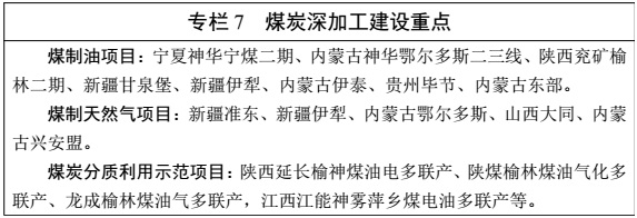 ——煤炭深加工。 按照國家能源戰略技術儲備和產能儲備示范工程的定位, 合理控制發展節奏, 強化技術創新和市場風險評估, 嚴格落實環保準入條件, 有序發展煤炭深加工,穩妥推進煤制燃料、 煤制烯烴等升級示范, 增強項目競爭力和抗風險能力。 嚴格執行能效、 環保、 節水和裝備自主化等標準, 積極探索煤炭深加工與煉油、 石化、 電力等產業有機融合的創新發展模式, 力爭實現長期穩定高水平運行。 “ 十三五” 期間, 煤制油、 煤制天然氣生產能力達到 1300 萬噸和 170 億立方米左右。