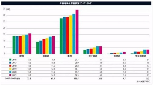 在南美洲, 盡管巴西的政治和經(jīng)濟處于困境, 但該區(qū)域的其他國家正在填補風電市場的空白, 特別是烏拉圭和智利,以及這一區(qū)域中最令人關注的阿根廷。 非洲2017年也將經(jīng)歷強勁增長, 由肯尼亞、南非和摩洛哥引領,非洲大陸上的未來發(fā)展圖景非常樂觀。 澳大利亞市場經(jīng)歷了一個短暫的沉寂后,也開始展現(xiàn)出恢復的跡象,特別是擁有一個堅實的待建項目管道,將確保未來幾年風電的增長。