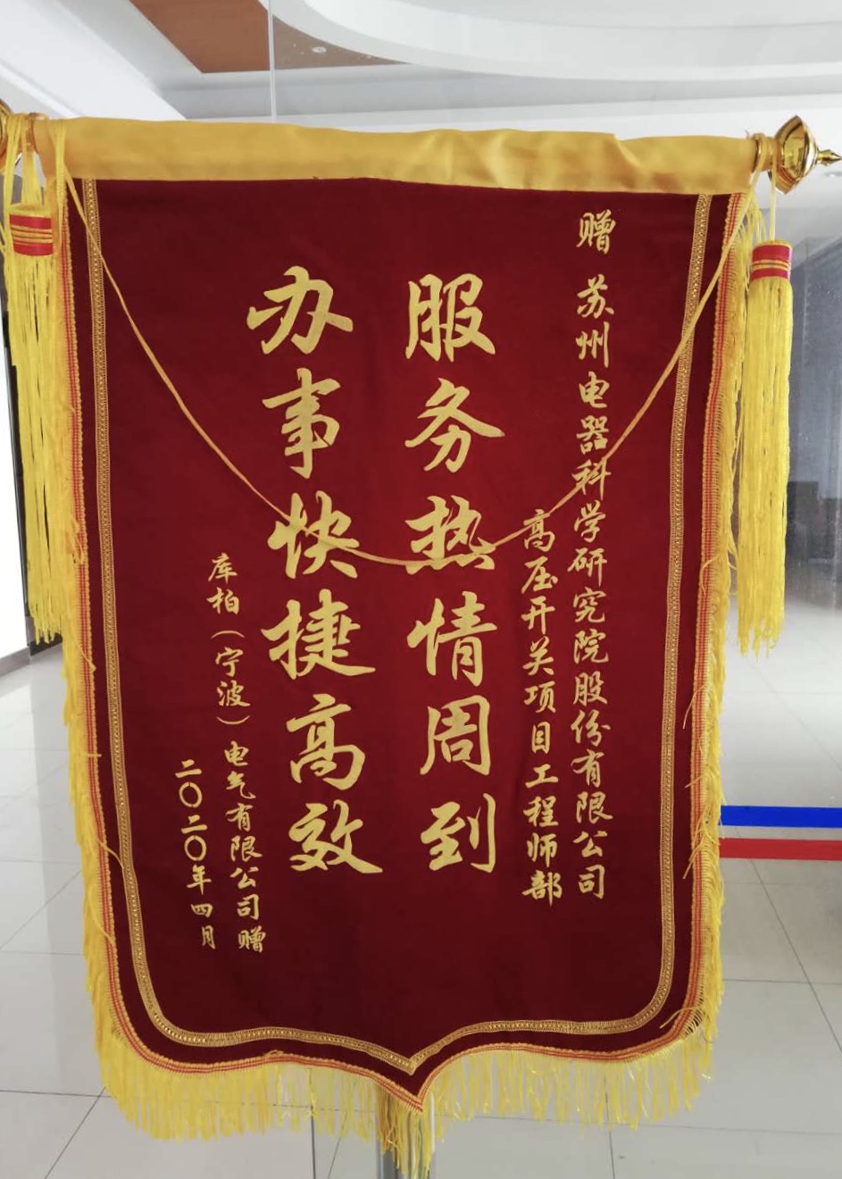 近日,庫柏(寧波)電氣有限公司將寫有“服務熱情周到 辦事快捷高效”的錦旗送到了蘇州電科院高壓開關項目部,對于疫情期間測試工程師提供的高效、優質的服務表示由衷的感謝。
